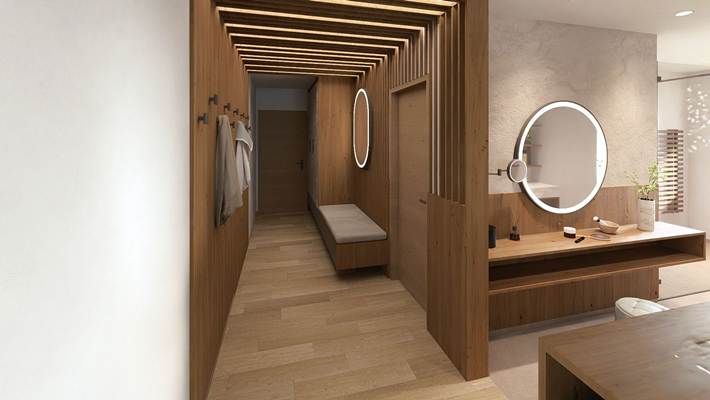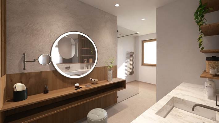 großzügiges offenes Badezimmer mit Dusche und Schminktisch,